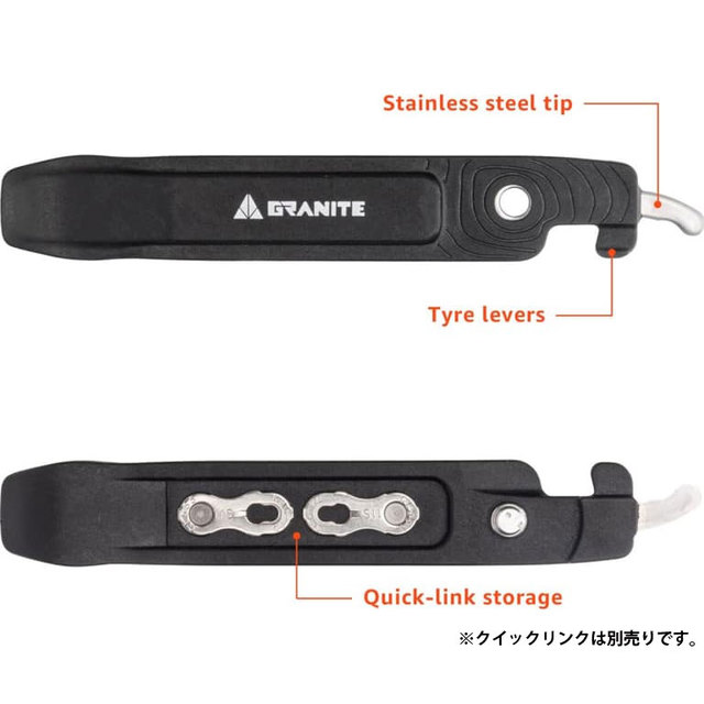 創意工夫に富んだ便利アイテムの宝庫、グラナイトデザインから組み合わせるとチェーンリンク外しになるタイヤレバーが出来ました!重量40gと軽量、そしてコンパクト。リンクを収納できるスペースもあります。(リンク別売)*このプライヤーはリンクを外す時のみ使用できます。リンクをはめる場合は、チェーンをチェーンリングに載せてペダルを踏んではめてください。